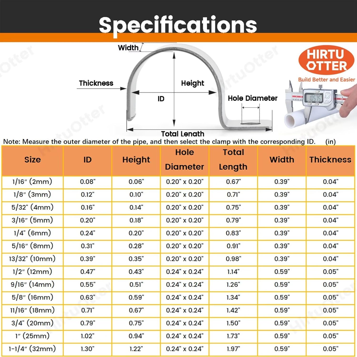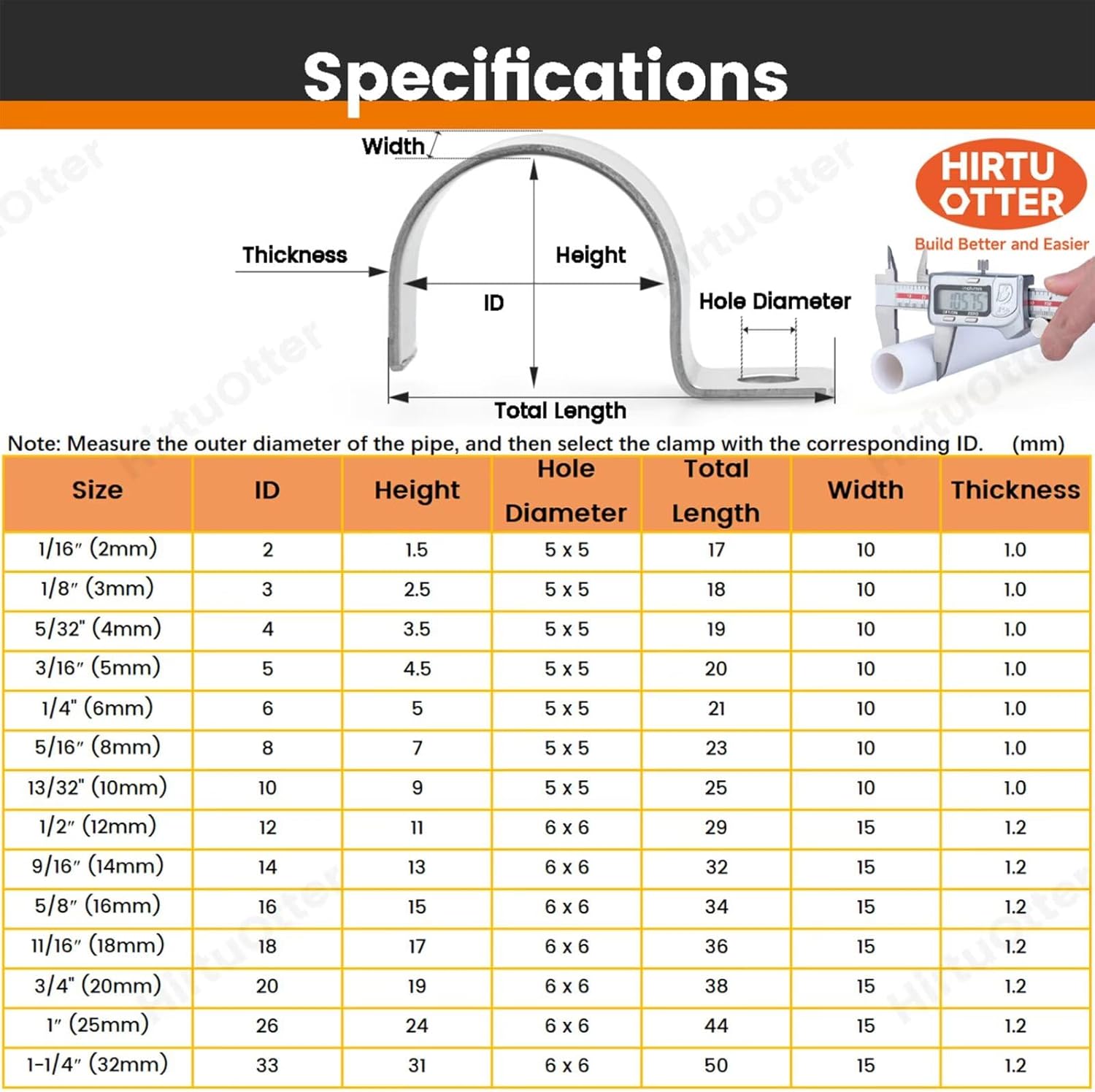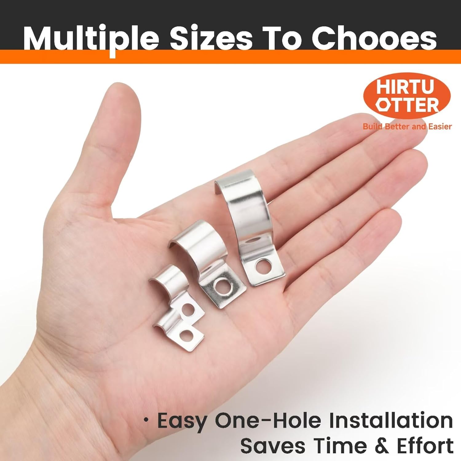 Stop Using Flimsy Clamps That FailHirtuOtter Heavy Duty Pipe Clamps are engineered for those who demand permanent reliability. Whether you are securing electrical conduit, plumbing lines, or outdoor equipment, this is the last clamp you will ever need to buy.WHY HIRTUOTTER CLAMPS STAND OUTGenuine 304 Stainless Steel – Superior corrosion resistance for indoor and outdoor use. Unlike galvanized or painted alternatives that degrade over time, these clamps withstand moisture, humidity, and harsh environments without rusting.Extra Thick Heavy Duty Construction – Noticeably thicker and wider than standard options. This robust design prevents bending or warping under heavy loads, providing a secure grip that stays tight installation after installation.One Hole Unilateral Design – Simplifies mounting and saves installation time. The single screw design allows for quick positioning and fastening, while the larger hole accommodates heavier duty screws for maximum holding power.WHERE PROS USE THESE CLAMPS Electrical – EMT conduit, rigid conduit, MC cable runs Plumbing – PVC pipes, copper tubing, PEX lines Outdoor – Irrigation systems, handrails, downspouts Industrial – Hydraulic lines, pneumatic tubing, equipment Workshop – Cable management, shelving, custom fabricationQUALITY YOU CAN SEE AND FEELSmooth Finished Edges – No sharp burrs that cut hands or damage wire insulation. Safe to handle, safe for your materials.Consistent Precision Fit – Every clamp in the pack matches exactly. Uniform support across your entire installation.Clean Professional Appearance – Natural 304 finish looks intentional and polished, even in visible installations.Marine Grade Durability – Salt spray tested. Proven in coastal environments where galvanized steel fails.FREQUENTLY ASKED QUESTIONS>Are these clamps truly stainless steel or just plated?Genuine 304 stainless steel throughout. Non-magnetic, salt spray resistant, and built to last — not painted or plated metal that flakes and rusts.>What size screws work with these clamps?The mounting hole is designed for #10 or M5 screws and larger. Use screws with a head diameter that fully covers the hole for maximum holding force.>Can I use these outdoors in coastal areas?Absolutely. 304 stainless steel is the standard for marine applications. A marine engineer customer specifically praised these for "excellent resistance to saltwater corrosion.">How do I know which size to order?Check the outside diameter of your pipe or conduit. The size in the product title refers to the OD these clamps are designed to fit.>Do these clamps have sharp edges?No. Every clamp goes through a deburring process. Edges are smooth to the touch — safe for hands and protective of wire insulation.THE HIRTUOTTER COMMITMENTBetter Products. Easier Installations. We stand behind every clamp with dedicated customer support — 24/7, real experts, no bots. If you have questions about sizing, installation, or which product fits your project, we are here to help.Order with confidence. Experience the difference that quality hardware makes.