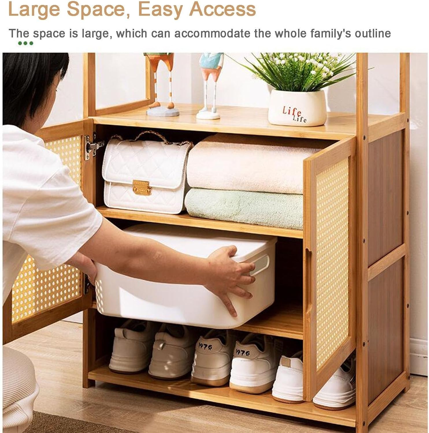 Enhance your entryway, mudroom, or bedroom with this stylish 4-in-1 Rustic Hall Tree, expertly designed to blend functionality with timeless elegance. Featuring a rattan-style coat rack, shoe storage bench, and multi-tier shelving, this versatile organizer provides ample space to neatly store shoes, boots, coats, bags, hats, and other essentials. Crafted from bamboo and breathable rattan mesh panels, the hall tree boasts durability and stability, while the choice between bamboo or glass cabinet doors adds a customizable touch of sophistication. Measuring 62/52cm x 31cm x 170cm, it fits comfortably into a variety of spaces without overwhelming your room. The included cushioned bench offers a convenient seating area for putting on shoes, while the multiple hooks and storage compartments keep everything within easy reach. Assembly is straightforward with detailed instructions, labeled screws, and all required tools included. Whether placed in your foyer, hallway, living room, or nursery, this hall tree is the perfect blend of rustic charm and practical storage, helping you maintain a neat and welcoming home environment.