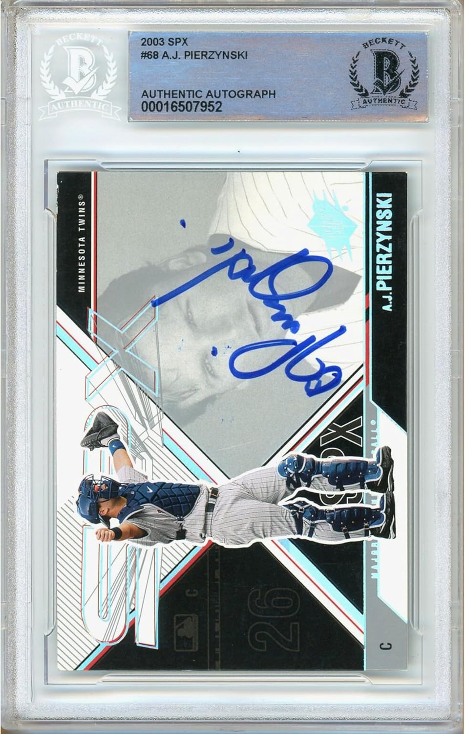 Add a premium Twins collectible to your collection with this AJ Pierzynski Signed and Autographed 2003 Upper Deck SPx card, professionally protected as a Baseball Trading Card Slabbed by Beckett Authentication Services (BAS). Featuring the Minnesota Twins MLB catcher, this SPx release is a display ready sports card collectible for baseball fans who want certified authentic memorabilia. The autograph is Beckett BAS authenticated and preserved in an encapsulated sealed slab protective holder for long term storage and clean presentation. For buyer confidence, the authentication number shown in photos and verifiable in the Beckett database, and the Beckett BAS slab serves as the included COA. This signed trading card looks great in a display case, desk display, or office display and it fits perfectly in a man cave or fan cave setup. It is a strong gift choice for Twins fans in Minneapolis and for collectors building a card collection focused on Upper Deck SPx hobby favorites and MLB memorabilia.