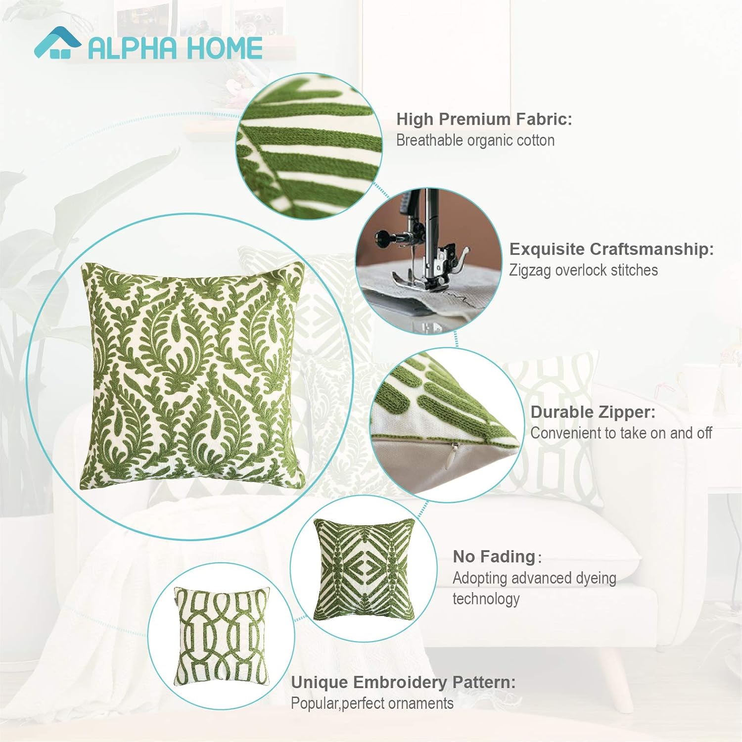 ALPHA HOME Throw Pillow Cover – Great decoration to your home Vivid and attractive embroidery pattern, 100% organic cotton material. They are pretty, soft and comfortable to use. Embroidery Pattern Design Different from the printed ones, we provide chic embroidery pattern with special chosen colors. The patterns are attractive and super soft to touch. Just give it a try. High Quality Lace Zipper We are using invisible lace zipper to make it great looking and more convenient to use. This zipper is smoother than normal ones and it can last longer for normal use. Specifications Material: 100% cotton Pattern: Teal/Pink/Gold/Gray/Army Green/Navy/Turquoise Size: 18" x 18", 4 pack Customer Service Don't hesitate to contact us if you have any problem with your order. Replacement or refund promised. ALPHA HOME – For A Better Home