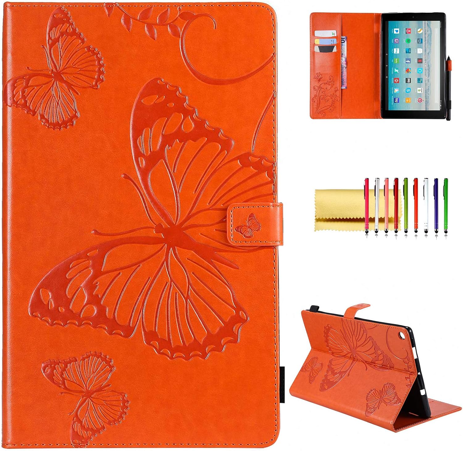 ✪✪✪ Pretty Amazon Kindle Fire HD 10 Wallet Case ( 9th Gen-2019 | 7th Gen-2017 | 5th Gen-2015 ) | Embossed Printed Magnetic Flip Cover, Auto Wake / Sleep ✪✪✪ ♚ Compatible Device: ✔ Amazon Kindle Fire HD 10 Tablet ( 9th Generation, 2019 Release ) ✔ Amazon Kindle Fire HD 10 Tablet ( 7th Generation, 2017 Release ) ✔ Amazon Kindle Fire HD 10 Tablet ( 5th Generation, 2015 Release ) ➹ Will NOT fit any other model, please kindly check your device carefully before purchasing. ➷ ♚ Features: Full Coverage: - Embossed PU leather exterior and inner soft TPU cover offers full-body protection. - Durable materials prevent your Kindle against dust, fingerprint, water, bump and scratches. Card Slots & Money Pocket: - Allow to put your business cards, credit cards and cash. - With this wallet case, brings you more convenient while on the go. FaceTime & Movie Stand: - Easily prop your tablet up sturdily while watching video/ movie and FaceTime, freeing your hands. Easy Accessible for Any Operation: - All features are available and stay sensible without removing the cover. Magnetic Cover: - Reliable magnetic clasp secures the case close seamlessly, easy to snap on and off. - Automatically wakes or puts your tablet to sleep when the lid is opened and closed. Unique Design: - Features a refined design, vibrant colors, comfortable grip, and easy to carry. ♚ Package includes: 1 x Kindle Fire HD 10 Cover Case ( 2019/2017/2015 release, 10.1" display ) 1 x Stylus Pen ( random color ) 1 x Cleaning Cloth If you have any problem of our product, please feel free to email us or "ask a question". Enjoy your shopping.
