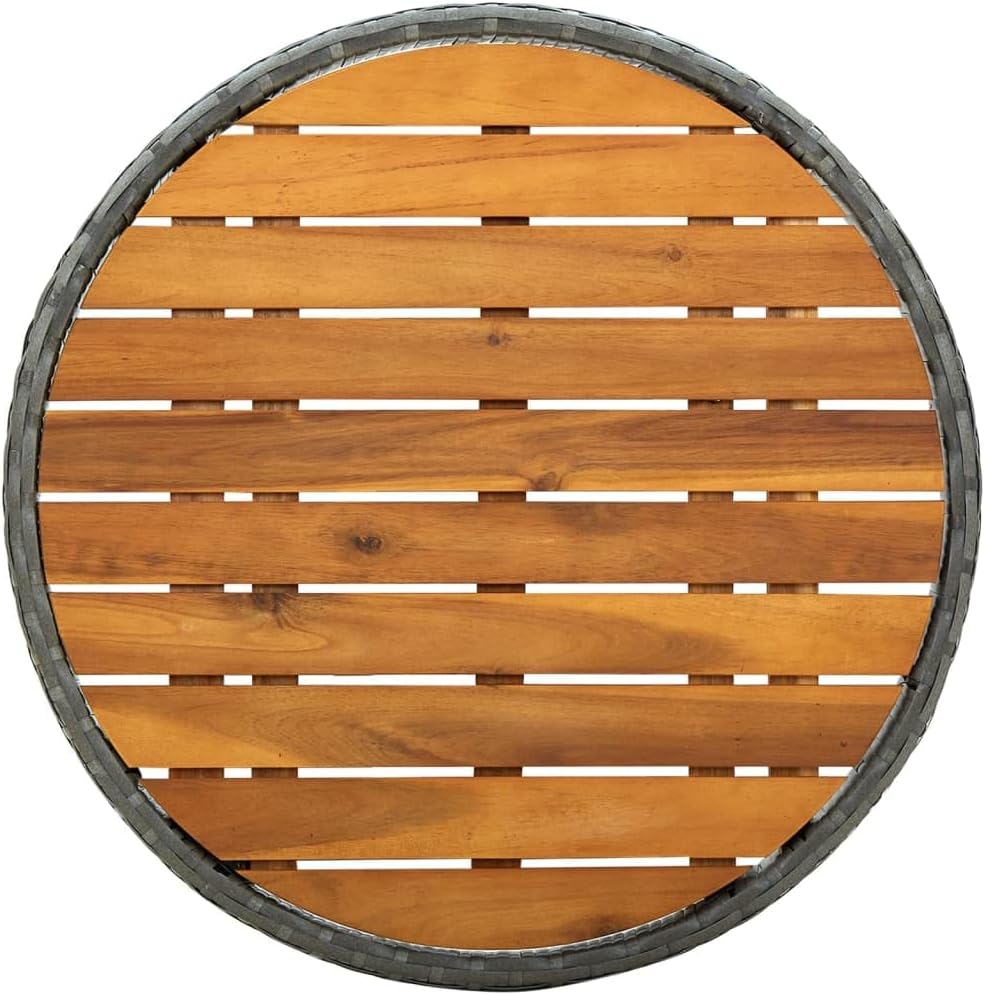 Enjoy a wonderful tea time with this rustic tea table. It makes a truly user-friendly and eye-catching addition to your garden and patio.Featuring a powder-coated steel frame covered with weather resistant PE rattan with UV protection, this table ensures years of outdoor use. Made of solid acacia wood in strong support, the tabletop is durable and sturdy. When not in use, the outdoor table can be easily folded away to save space.Note: In order to extend the life of your outdoor furniture, we recommend you to clean it regularly and do not leave it outdoors without protection unnecessarily.Clean: Use a mild soap solutionStoring: If possible, store in a cool, dry place indoors. If the product is stored outdoors, protect it with a waterproof cover. Wipe and dry the excess water or snow from flat surfaces after a rain or snowfall. Allow sufficient air circulation to avoid moisture-related damage.
