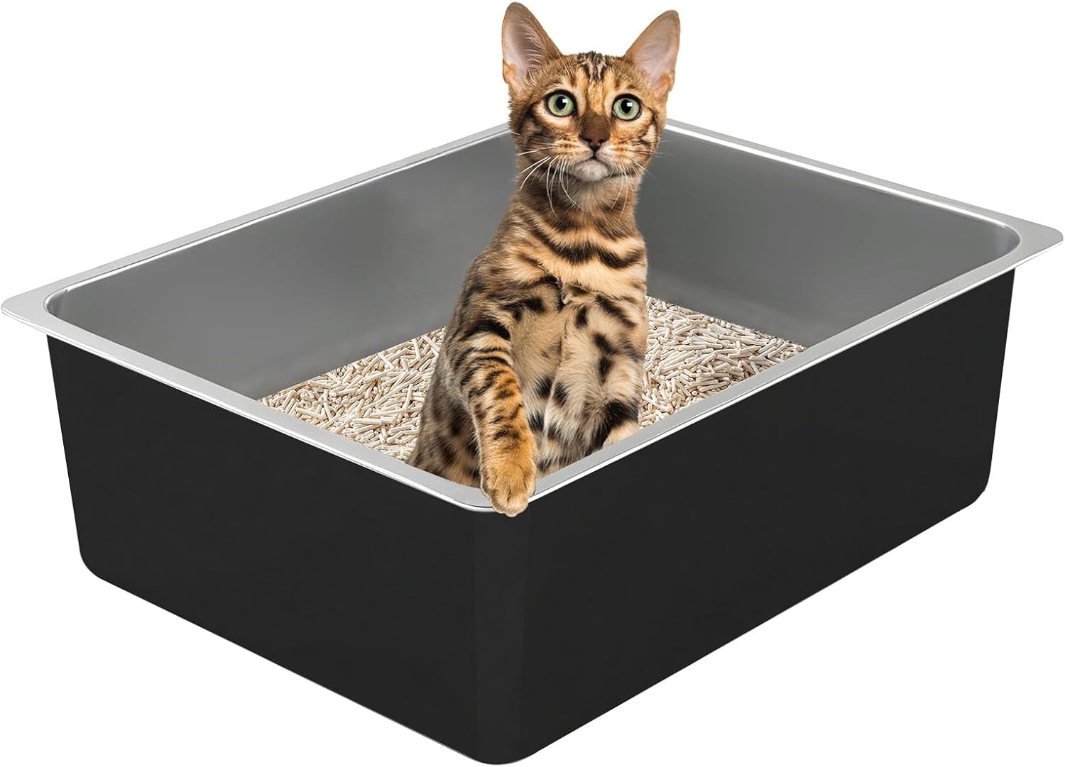 XL Deep litter box for multi-cats family – Durable 23.6 x15.75 x6 Inch tray with extra large toilet space designed for kittens and big cats. The litter box with 6-inch high walls reduce litter scatter and urine splashes. Scratch-resistant stainless steel outperforms plastic—easy to clean, odor-resistant, and multipurpose, such as bath, feeder or pet toilet. Smooth edges ensure safety; open-top design allows easy access. Reinforced base prevents tipping. Wipe or rinse for instant hygiene. Specification: Product name: Stainless steel litter box Material: Stainless metal Features: Non stick, no smell, easy to clean, non stick, odorless, rust resistant Dimensions: 23.43 x15.55 x6 Inch Design: High side and open top litter pan Application: Indoor use Others: Preventing pets from chewing or scratching, safer for pets